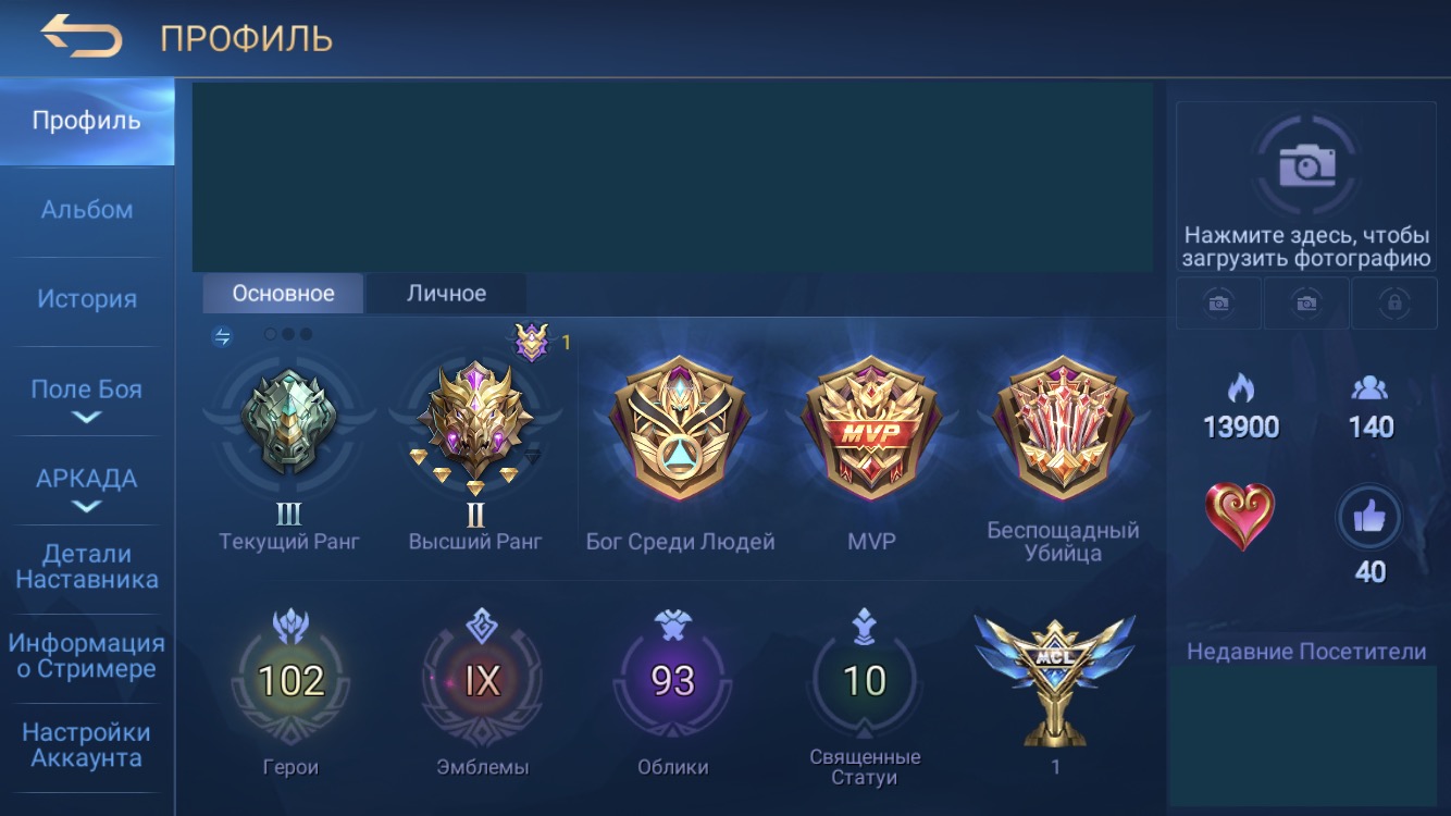 Продам акк Mobile Legends. Текущий ранг - Эпик 3. Высший ранг - Мифик 2. Небесный уровень - 54. Все герои в наличии(102). Все эмблемы прокачены на макс. 93 облика(ВСЕ СЕЗОННЫЕ ОБЛИКИ В НАЛИЧИИ s1-s18, ELITE - 19 шт. SPECIAL - 9 шт. EPIC 1 шт. STAR - 2 шт. KOF - 1шт.) 10 священных статуй. 8,5к боев. 58,51% побед. Множество различных боевых эффектов. 15 эмоций. На счету: 77к БО, 3.6к билетов, 9 алмазов. 3 титула MCL(2 еженедельных, 1 финальный). Привязки все есть. А так же в наличии под руководством собственный клан. Имеется карта изменения имени. В сумке множество различных ништяков;) пробные карты героев и т. д.