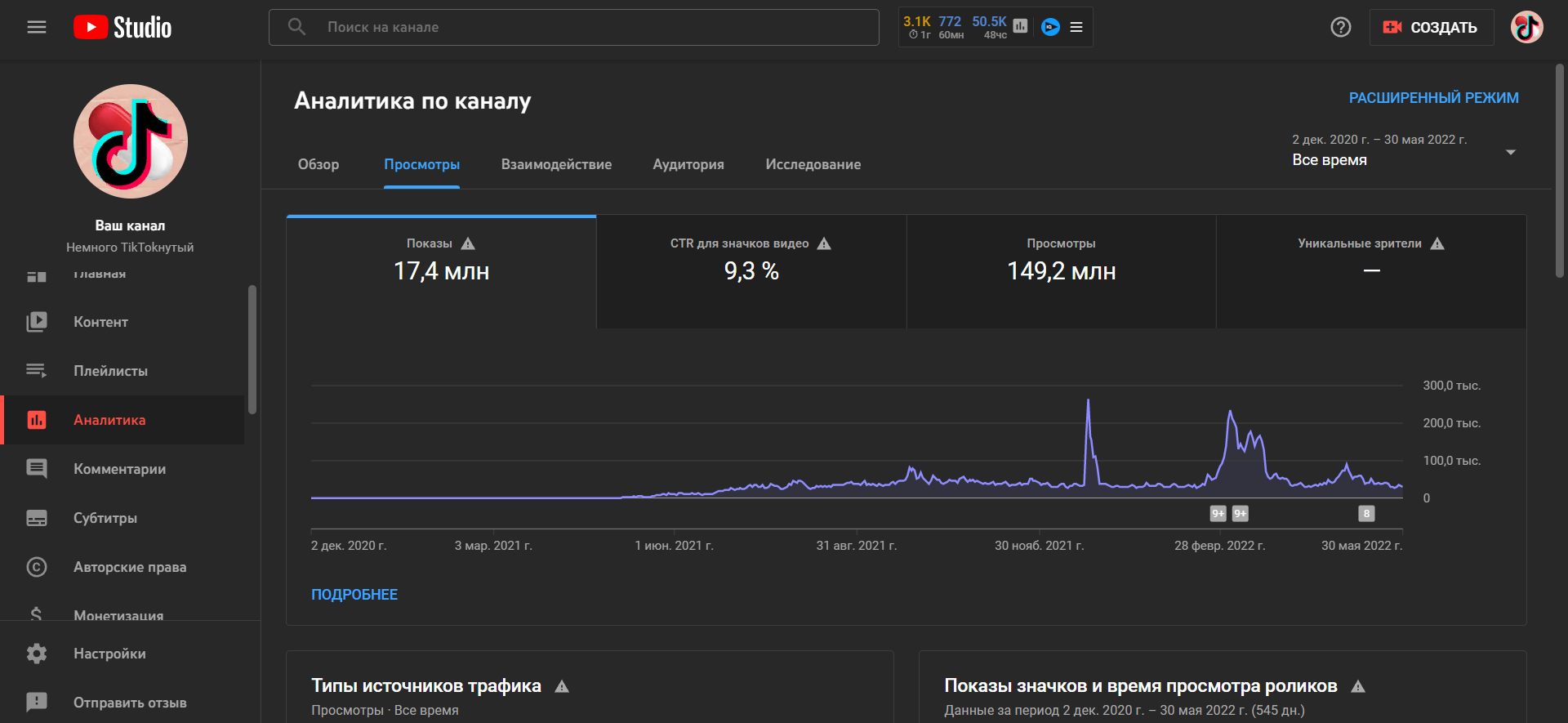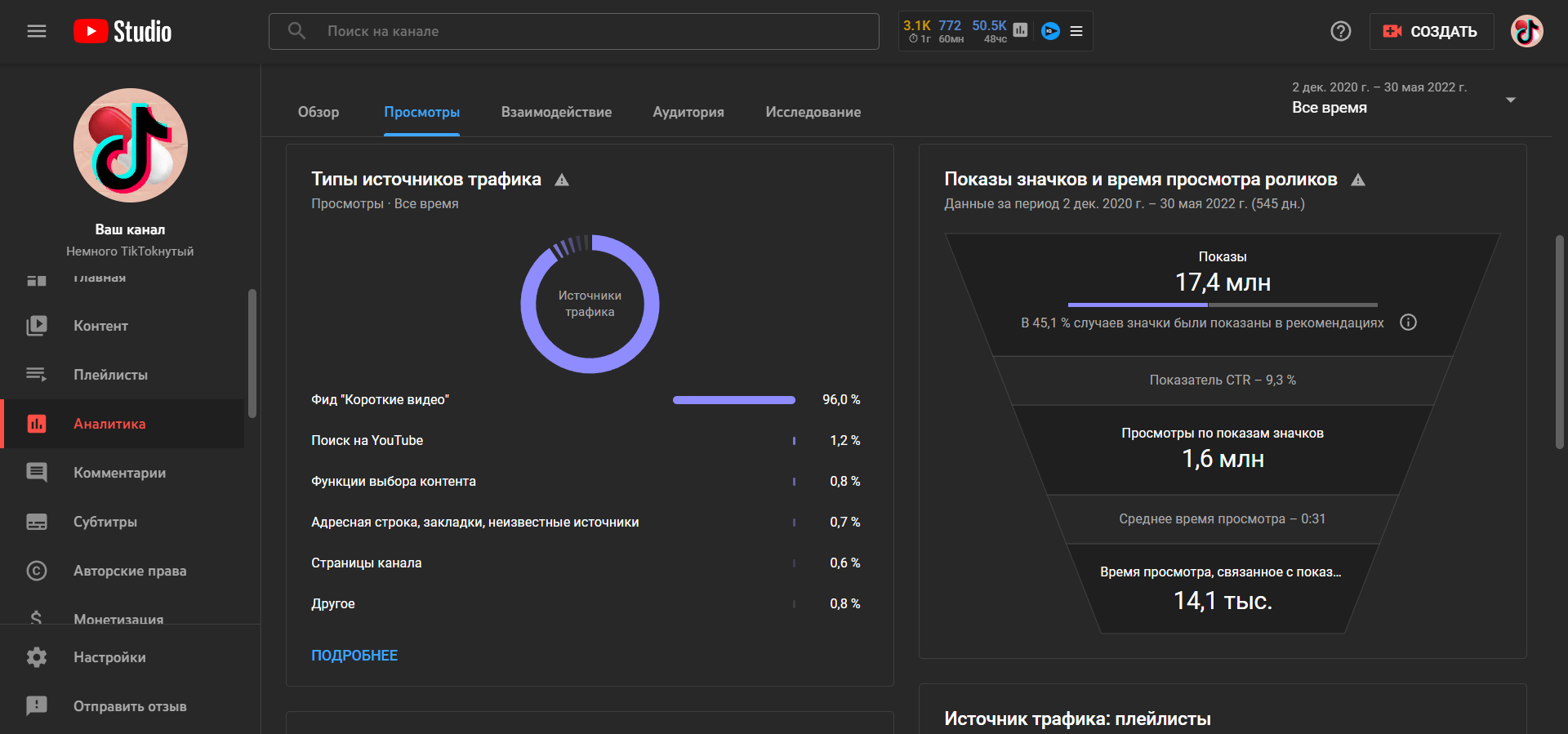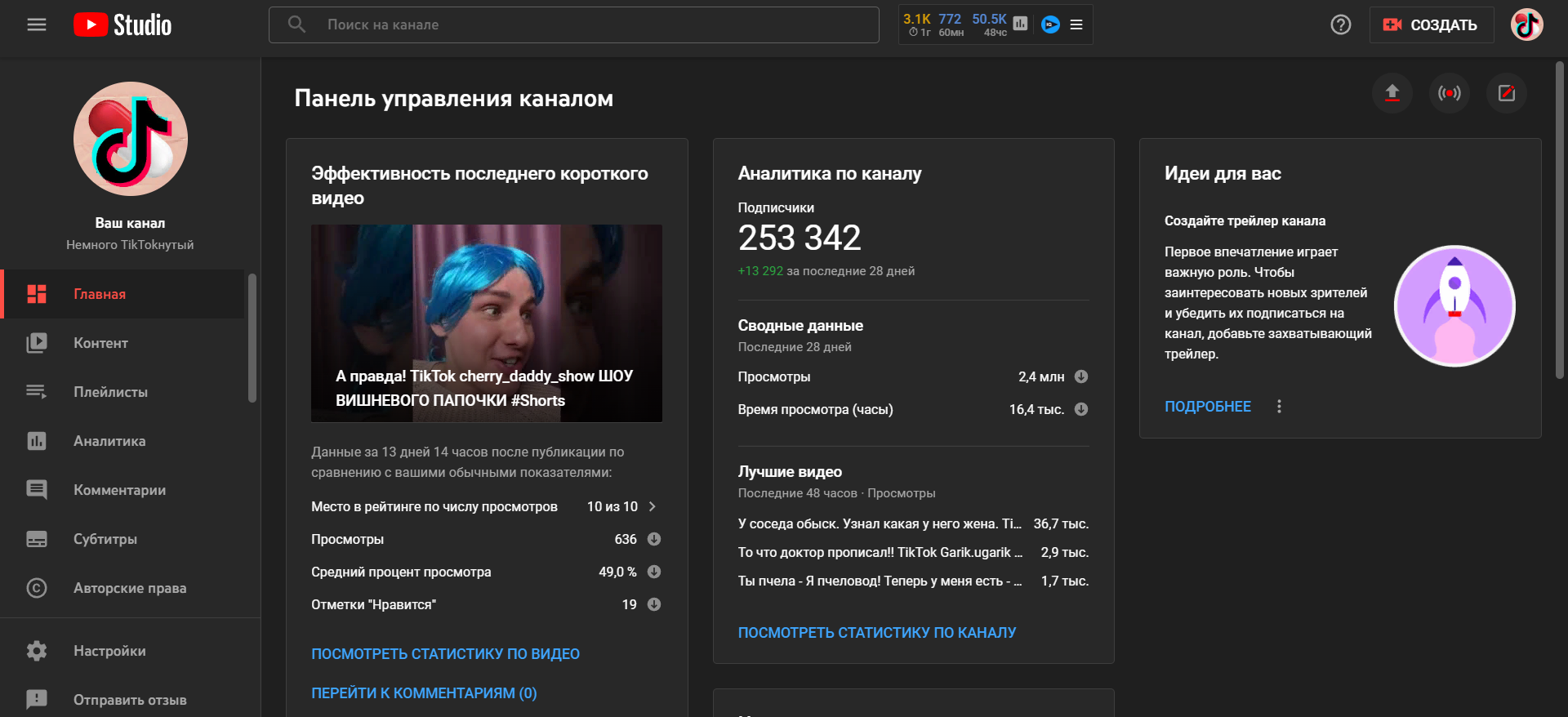 Каналу год. Не накручен. Статистику выложил в фото. Практически все видео Shorts. На монетизацию выйти не вышло, по часам. Да и не дадут монетизацию за шортс контент. Видео из рекомендаций ТикТока.