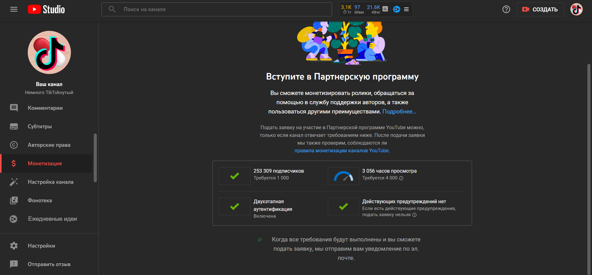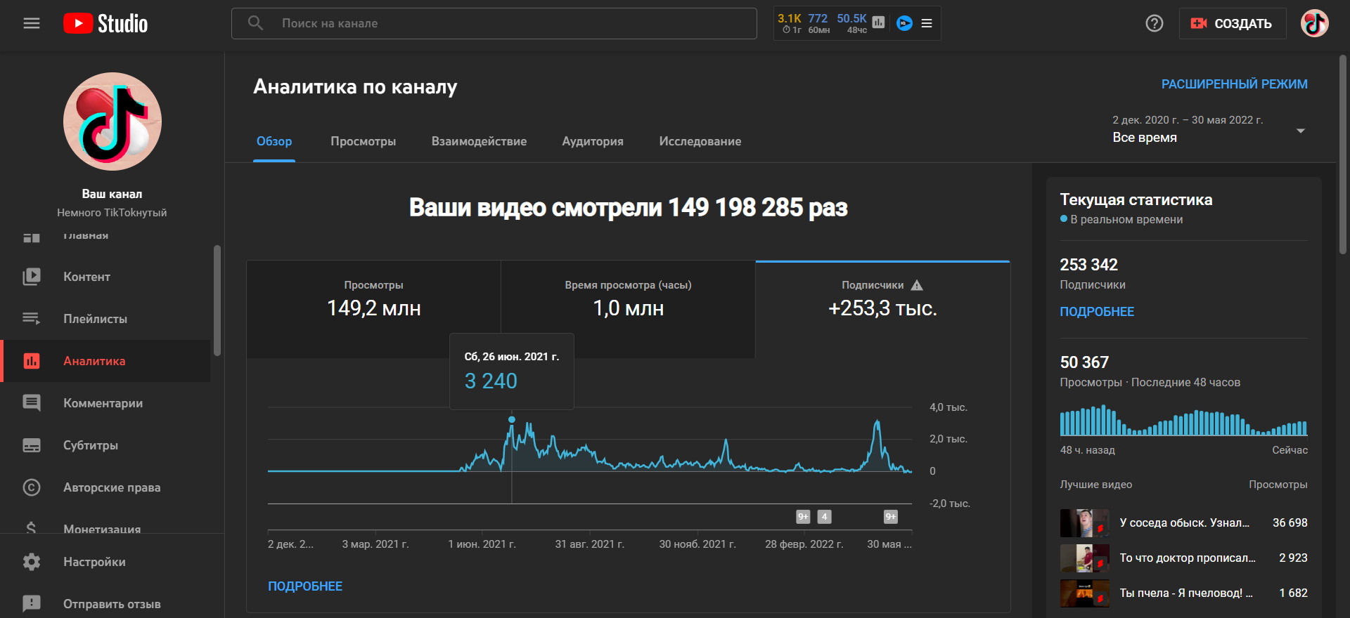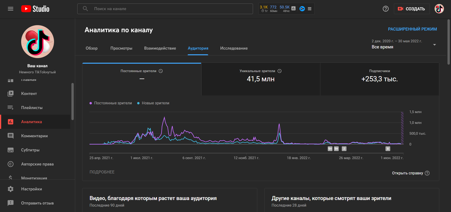 Каналу год. Не накручен. Статистику выложил в фото. Практически все видео Shorts. На монетизацию выйти не вышло, по часам. Да и не дадут монетизацию за шортс контент. Видео из рекомендаций ТикТока.