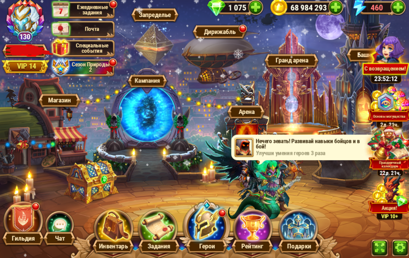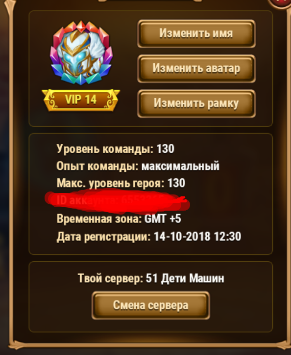 Сервер 51, Дети Машин, зарегистрирован в игре в 2018 году, вложено порядка 90к , ВИП 14, не играл больше года, пока игра была ВКонтакте, за меня играл соклановец, игру с ВК убрали, но я успел сохранить код перехода и восстановил прогресс. Титаны 1,3М - просели за время моего отсутствия, герои 2,8М