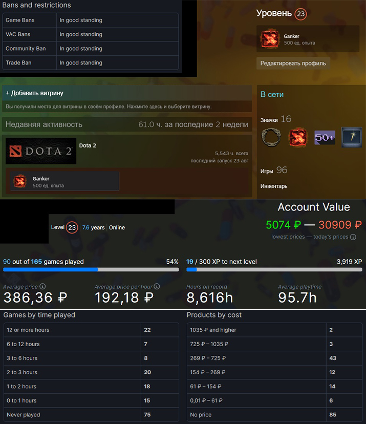 23 уровень Steam, 16 собранных значков, аккаунту 8 лет. Почта оригинальная, но письма подтверждения нет. Без блокировок и VAC банов.