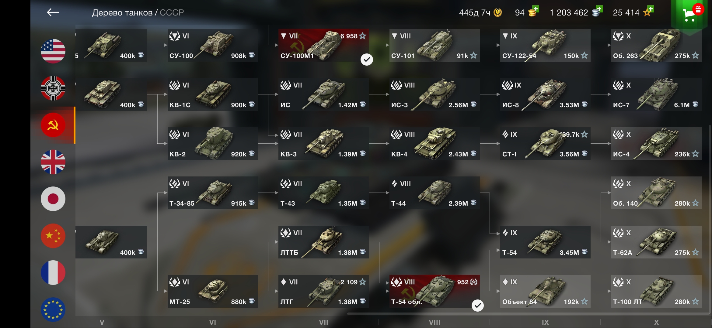 СССР Об.268 (10 уровень), СУ-100М1 (7 уровень), ИС-7 (10 уровень), СТ-1 (9 уровень), Т-54 (9 уровень), Т-54 обл.(8 уровень).