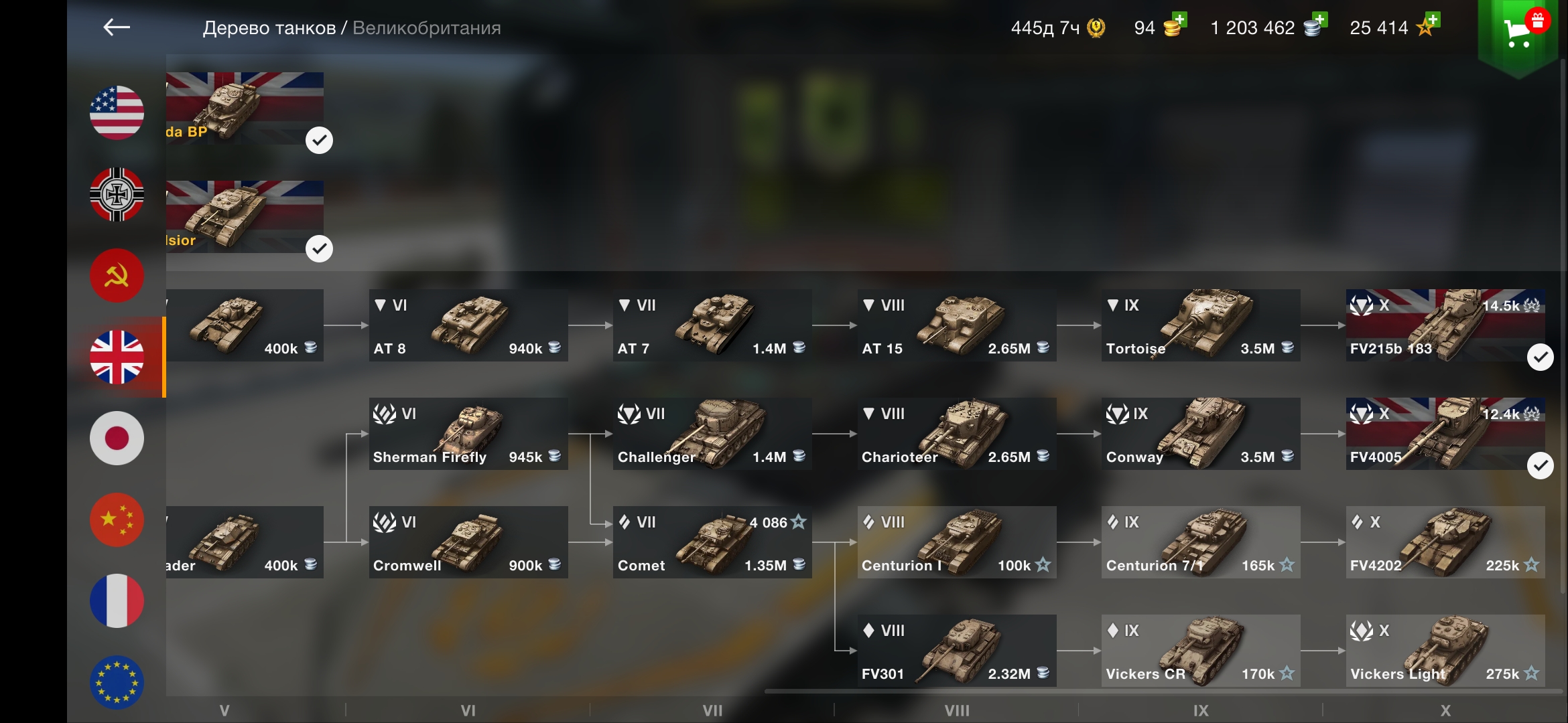 Велокобритания FV215b 183 (10 уровень), FV4005 (10 уровень), Comet (7 уровень), FV301 (8 уровень), Сonqueror (9 уровень).