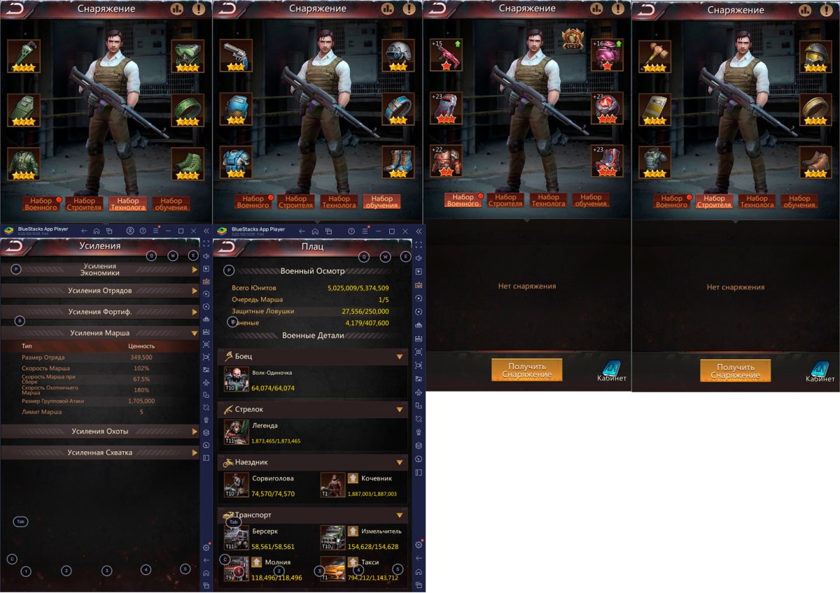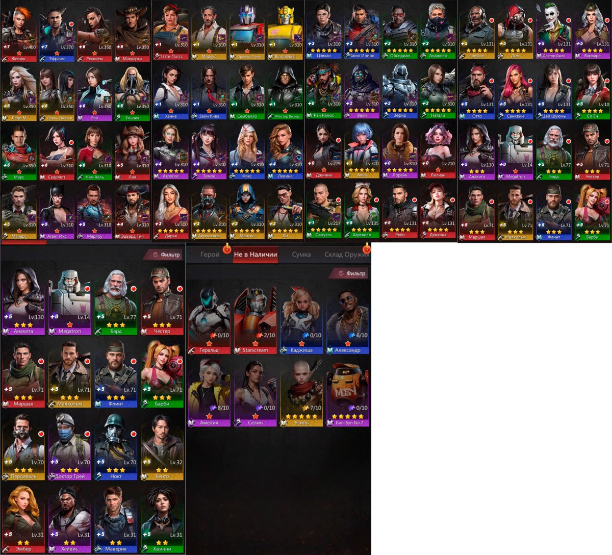 В наличии снаряжение постройки, исследования и обучения. Окраска убежища, два вида маршей. Жетонов костюма хватает на покупку нового марша. 60 монет временного найма (ещё 10 можно взять из ящиков). Много разных героев.